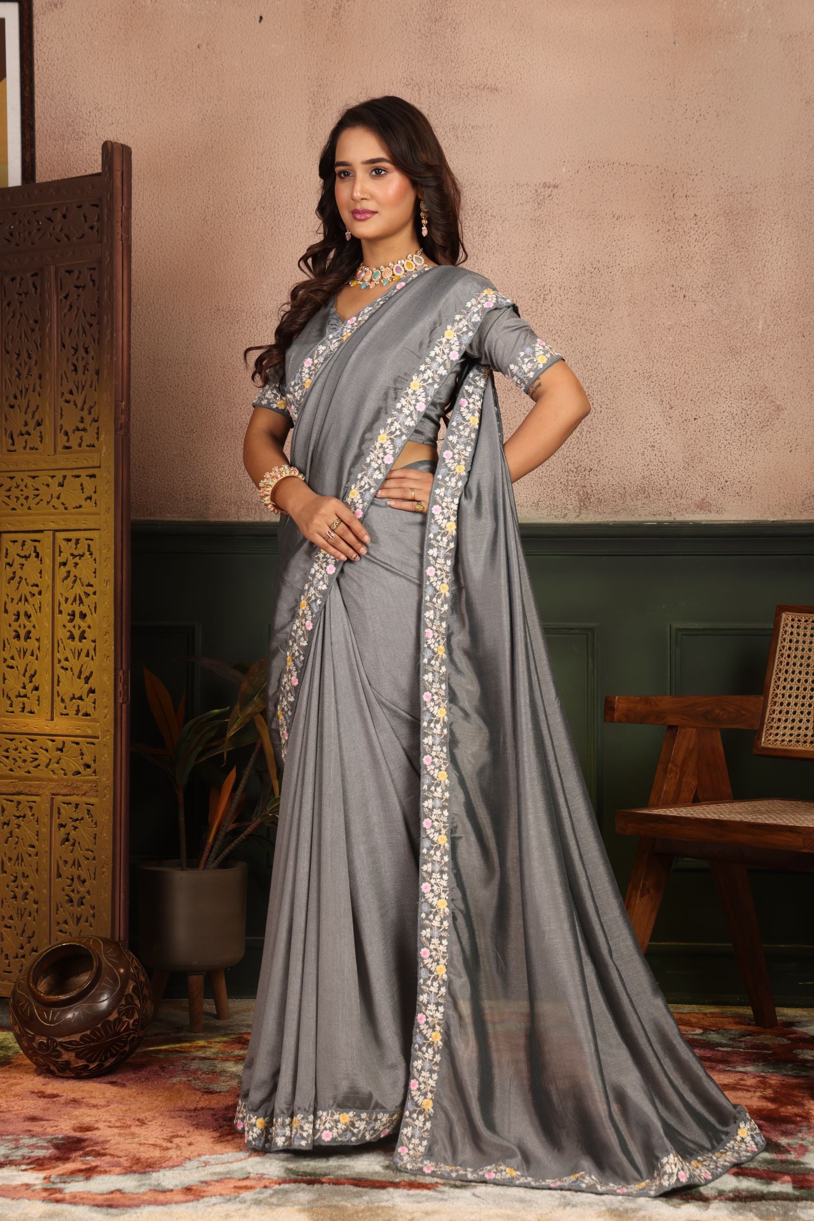 Niravi — Grey Embroidered Vichitra Silk Saree