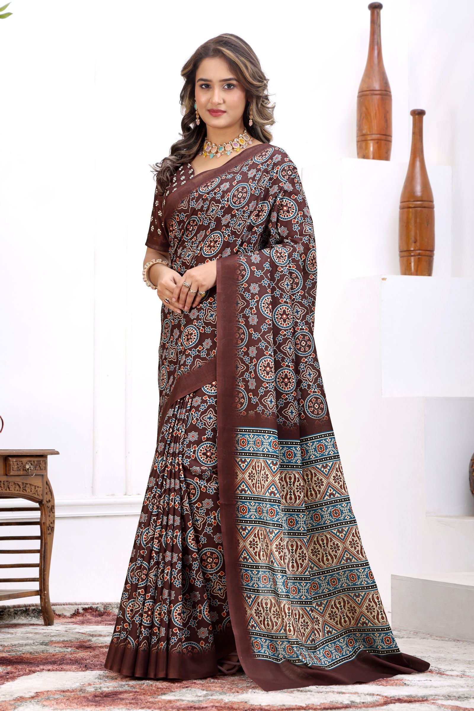 - Pattern: Ajrakh-inspired circular and geometric ethnic digital print.